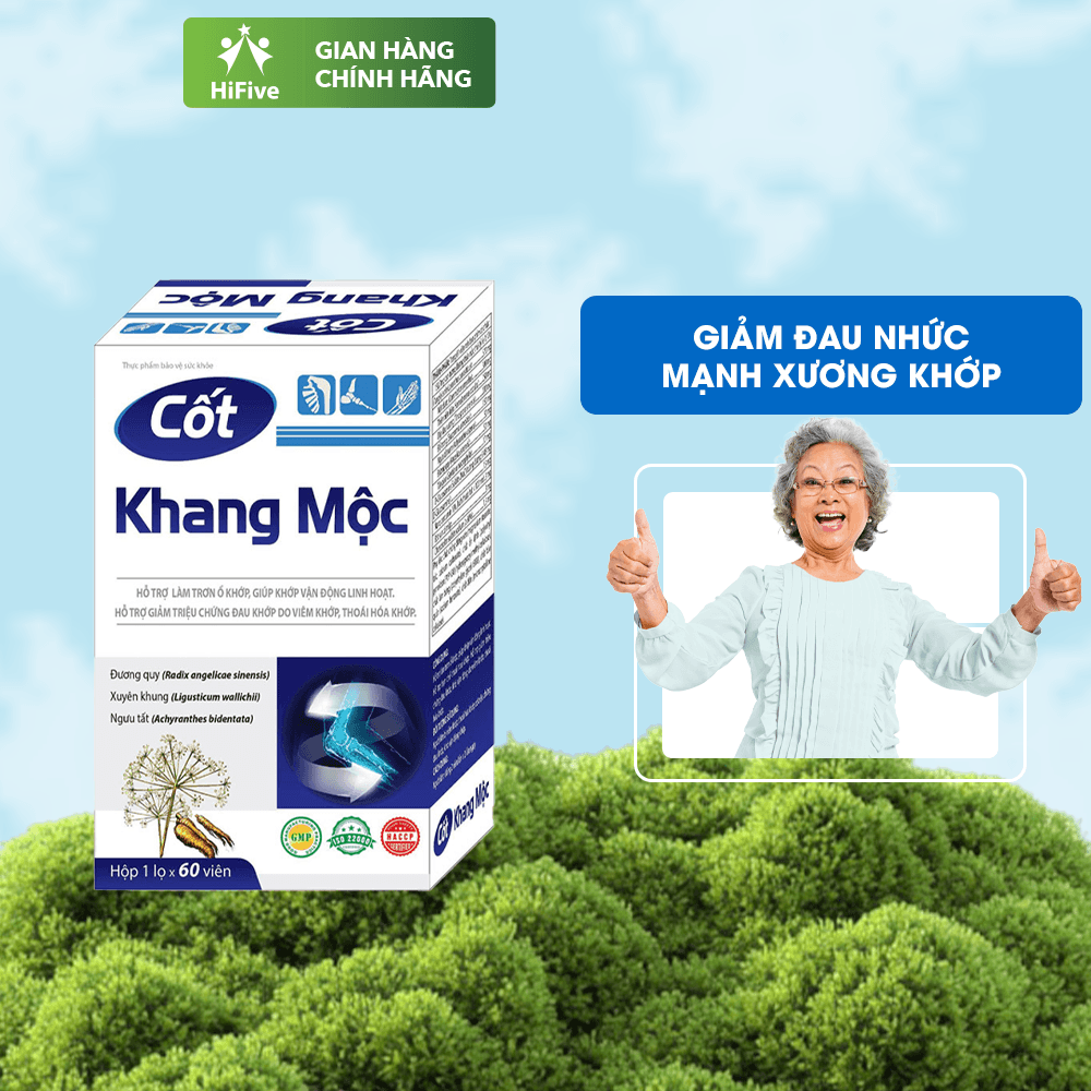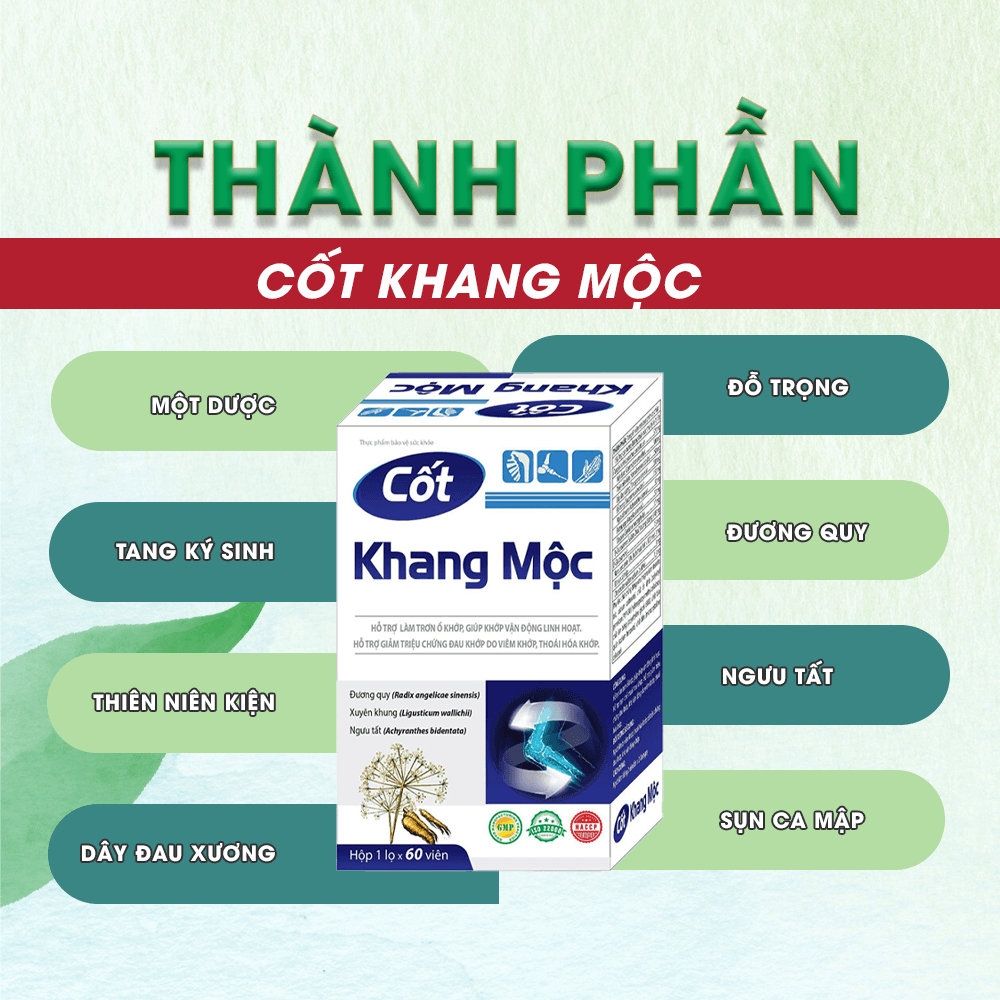 Cốt Khang Mộc kết hợp glucosamine – hỗ trợ cấu trúc sụn –, chondroitin và nano curcumin với các thảo dược nhỏ như tang ký sinh, thiên niên kiện, đỗ trọng… được đánh giá giúp giảm triệu chứng đau nhức khớp, hỗ trợ vận động linh hoạt sau 1–2 liệu trình. Sản phẩm được cấp phép lưu hành và phù hợp sử dụng dài hạn.