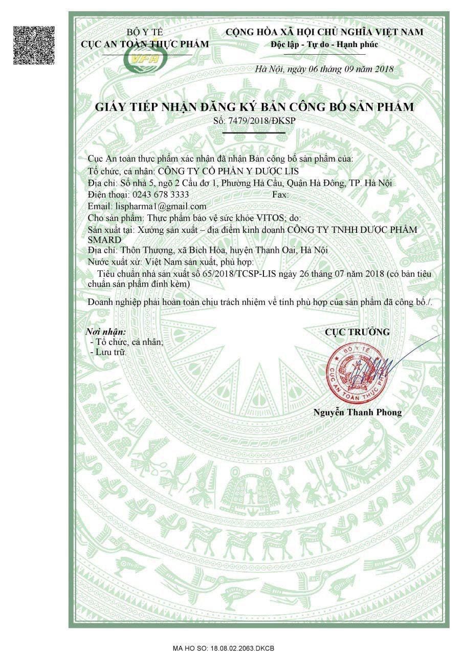 Giấy xác nhận: 7479/2018/ĐKSP và các số 01250/2019/ATTP-XNQC, 3104/2020/XNQC-ATTP