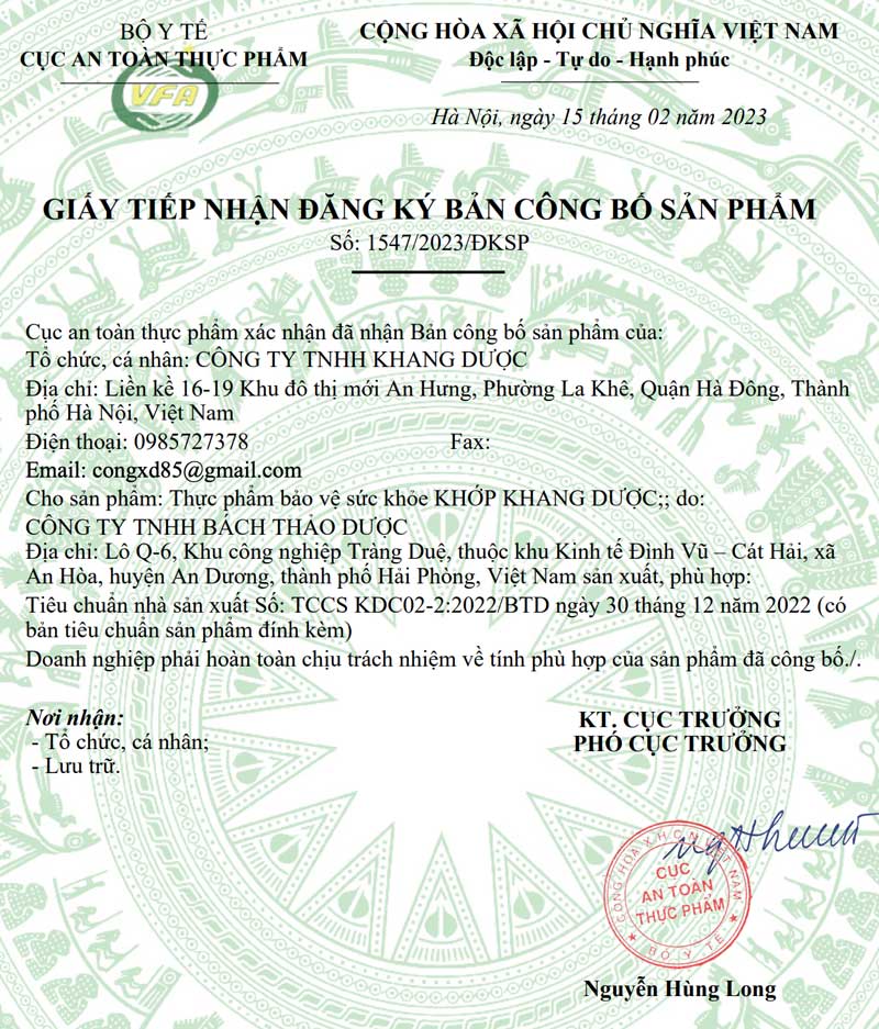 Khớp Khang Dược là thực phẩm bảo vệ sức khỏe được sản xuất bởi Công ty TNHH Khang Dược, đã được cấp phép lưu hành bởi Cục An toàn Thực phẩm – Bộ Y tế. Sản phẩm được bào chế dưới dạng viên uống tiện dụng, hỗ trợ cải thiện các triệu chứng viêm, đau và thoái hóa khớp, đồng thời giúp khớp vận động linh hoạt hơn.
